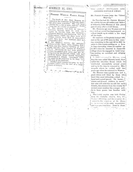 Mrs. Moonan was born in Queen's County, Ireland, April 13, 1831. She came to America with her husband, Partick Moonan and located in 1855 in this county which has since been her home, first in Iosco, then in Janesville and then here. Her husband died in November 1899.